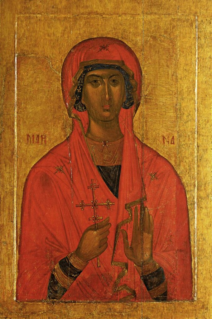 Девства добротами преиспещренна, дево,/ нетленными венцы венчалася еси, Марино,/ кровьми же мученичества обагрена,/ чудесы просветившися исцелений,/ благочестно, мученице, прияла еси почесть победы твоего страдания.