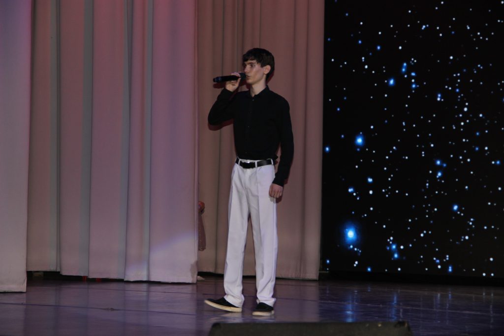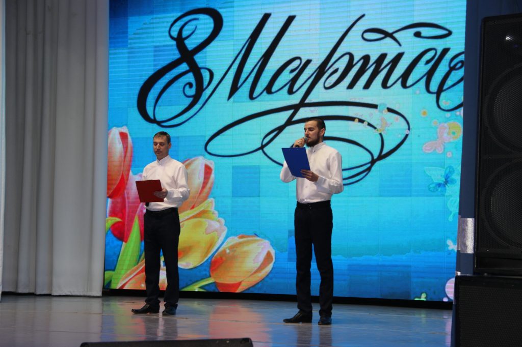Затем на сцене появились ведущие — В. Стремоухов и Д. Гуров, которые тепло поприветствовали зрителей и поздравили всех женщин с наступающим праздником Весны.