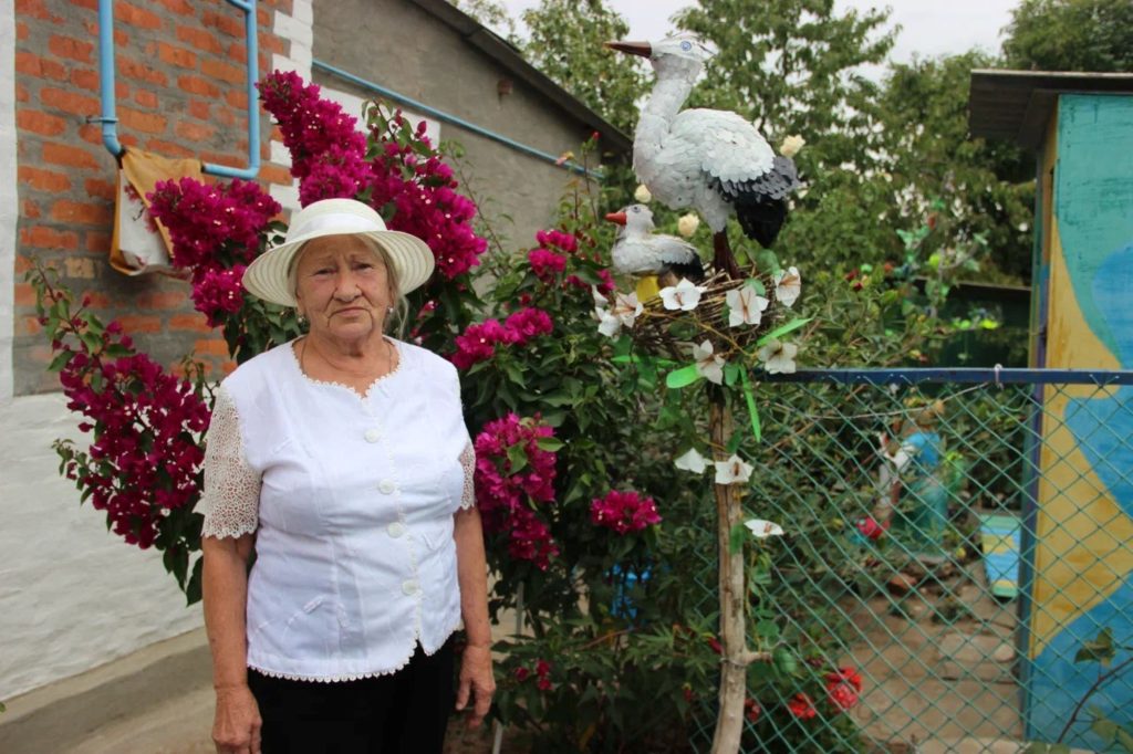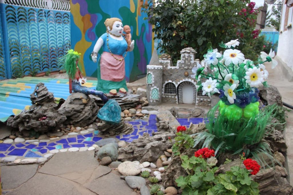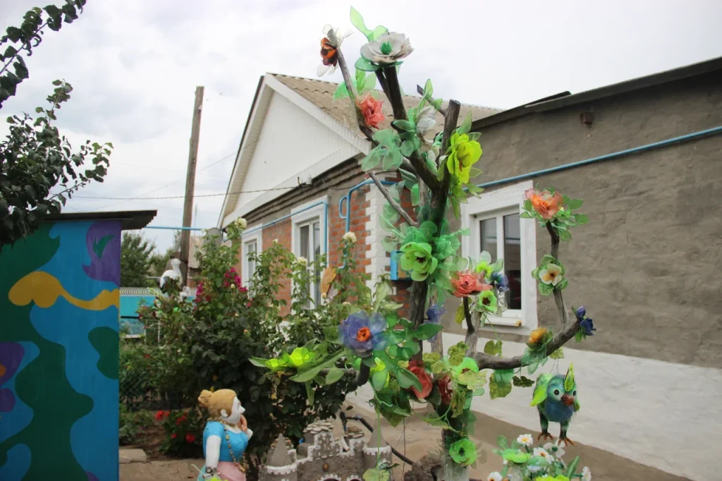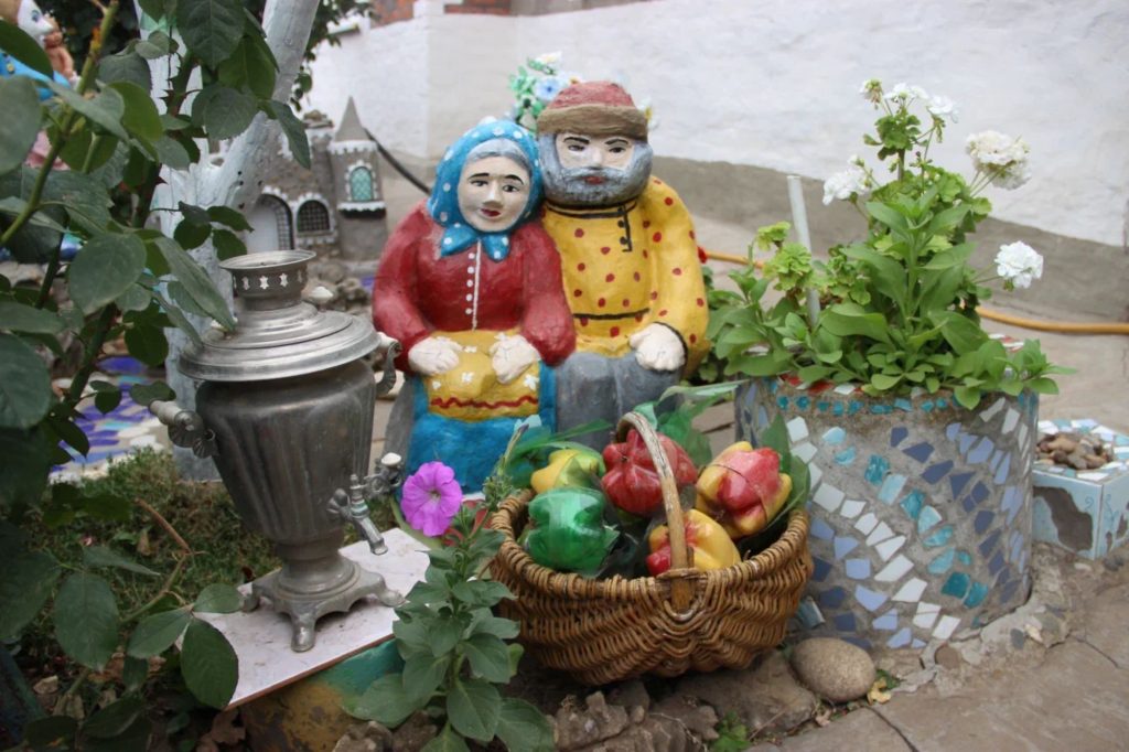 Заходишь во двор к Зинаиде Георгиевне Калмыковой и попадаешь, словно в сказку, наполненную интересными и яркими сюжетами. Сделаешь шаг и видишь мать-казачку с младенцем на руках, сделаешь второй шаг – пара аистов ютится в гнезде на дереве – все это и многое другое сделано руками Зинаиды Георгиевны. Какие-то фигуры из цемента, а что-то из пластика. Зинаида Георгиевна все своё творчество и талант направила на то, чтобы сделать жизнь вокруг себя интереснее и ярче.