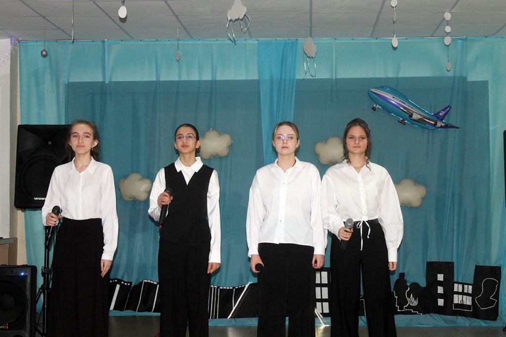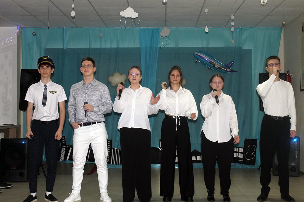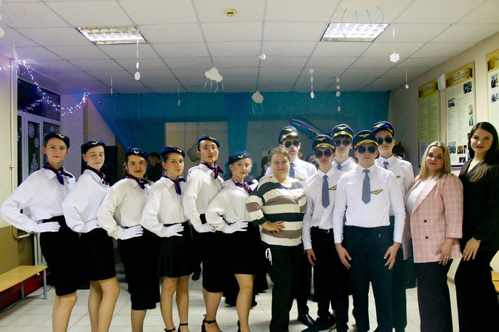 «Уважаемые пассажиры авиалайнера «Назад в прошлое». Мы начинаем наш полёт! Возможен южный ветер приятных воспоминаний. Ожидаются осадки в виде слёз от радости встреч. На борту царит хорошее настроение, море впечатлений и улыбок! Пристегните ремни! Мы взлетаем!» — обратился к залу стюард. Стюардесса добавила: «Здравствуйте, дамы и господа! Здравствуйте, дорогие друзья! Мы рады видеть знакомые лица! Рады, что вы пришли на встречу со школой, учителями, друзьями, на встречу со школьным звонком!». Директор школы Юлия Александровна Шляхта, выступившая в роли командира экипажа, пожелала всем приятного полёта «в бескрайнее синее небо школьного детства».